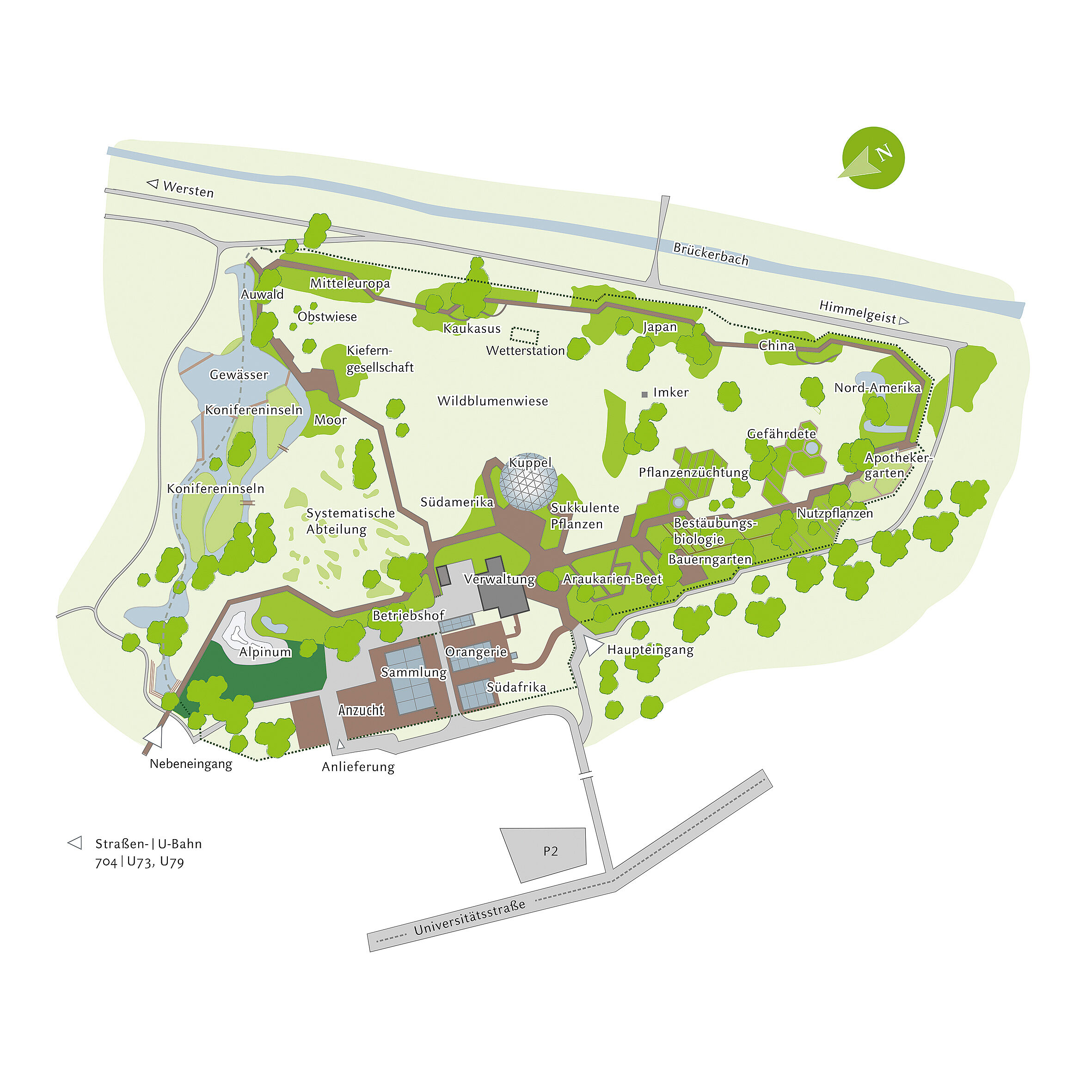 The outdoor grounds of the botanical garden spans around 8 hectares. A wheelchair-accessible circular trail, approximately 1 kilometre long, guides visitors through the garden. Large parts of the garden are designed to match the domed greenhouse with its triangular windows and trapezoid entrance area: the routes and plant plots were laid out on the basis of its striking angles, for example.