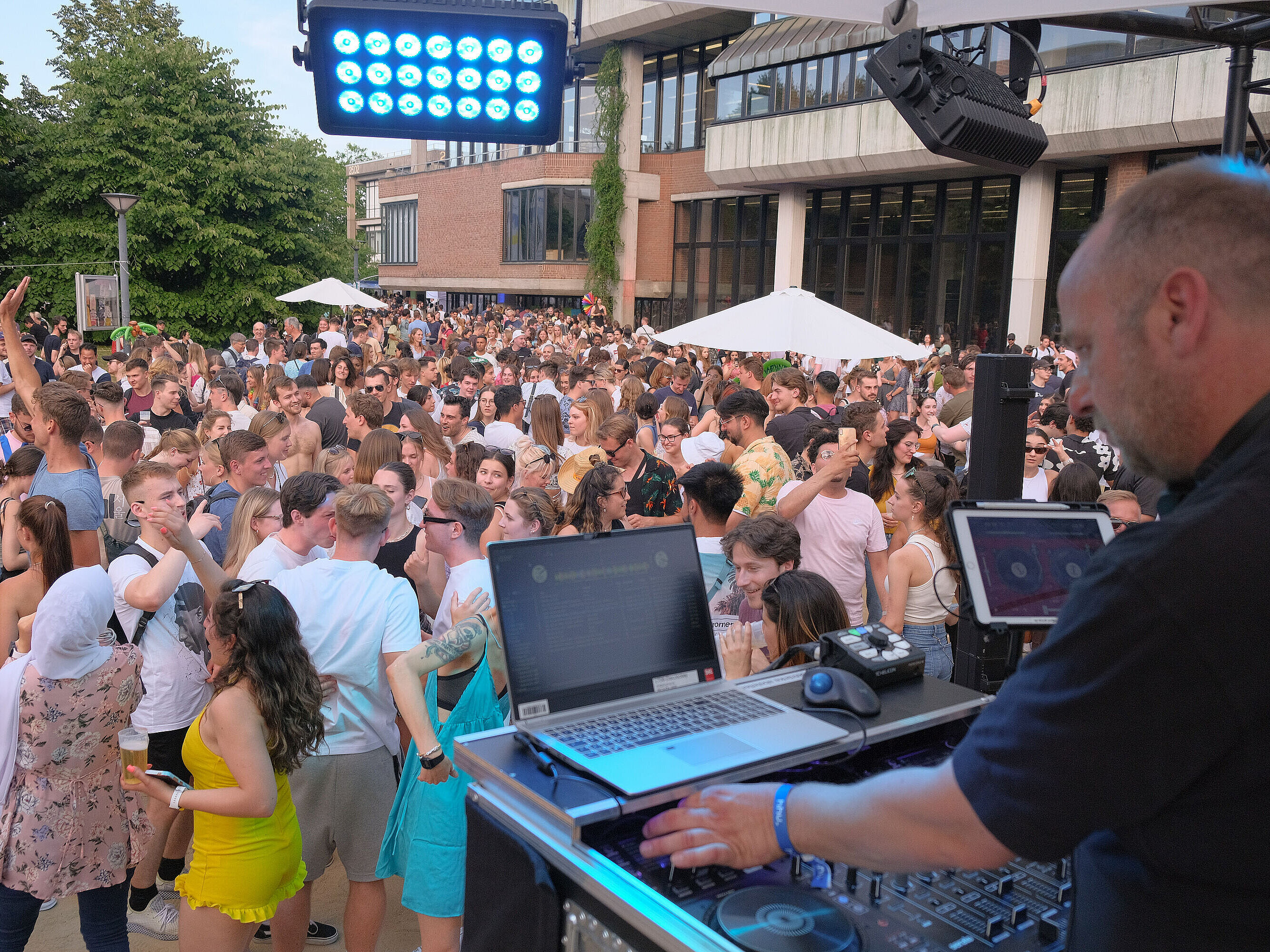 | Auf dem Platz vor der Unibibliothek findet im Juni die erste Summerbeachparty statt. Rund 80 Tonnen Sand wurden dafür vor die ULB transportiert, um für eine sommerliche Atmosphäre zu sorgen: Das Herz der Universität verwandelt sich erstmals in einen Partystrand. | |
