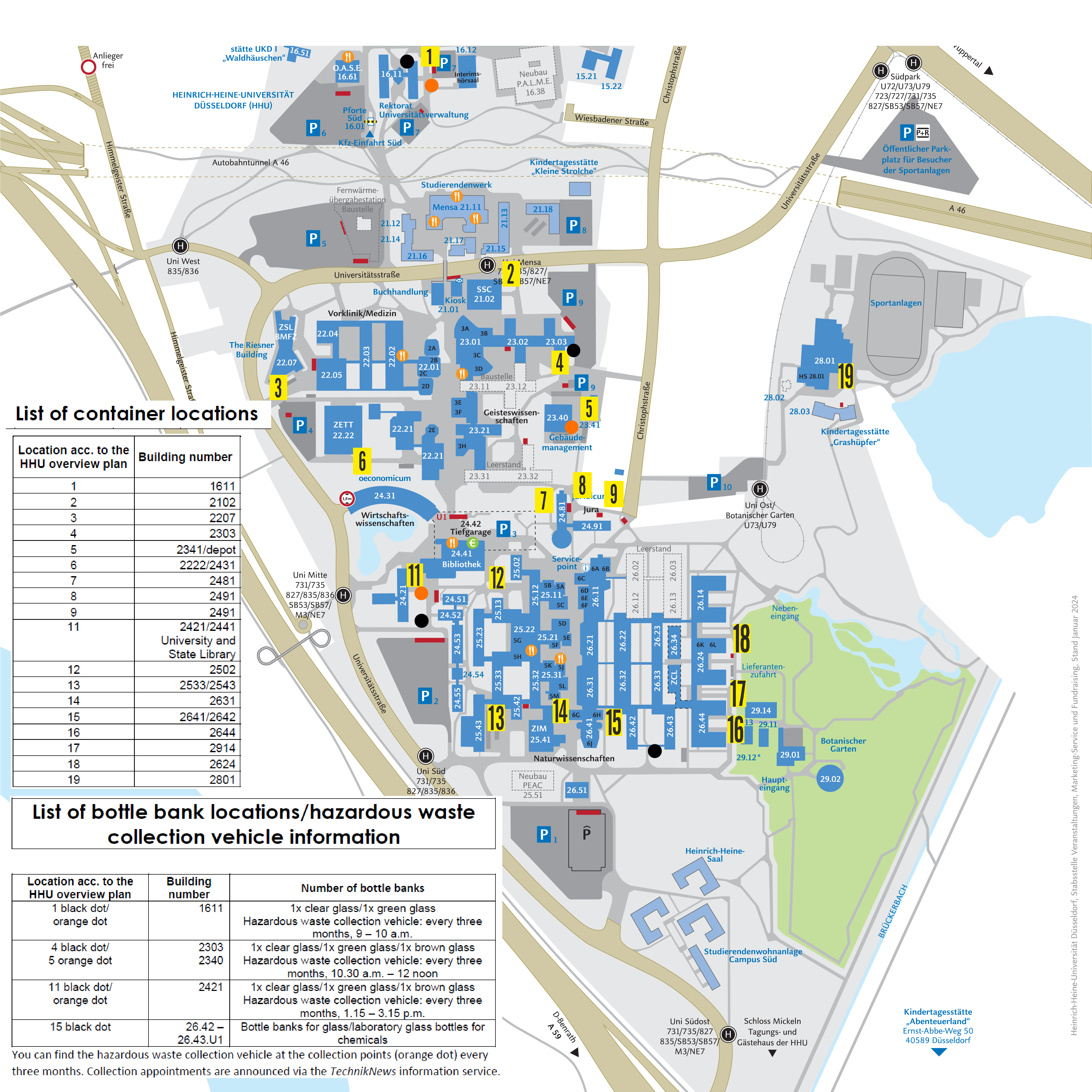 There are 19 container sites for residual waste, paper and even waste glass on campus (see map). The latter in particular should not just be left out for the cleaners; instead, everyone should take their glass to the bottle banks themselves. Perhaps simply on the way home?