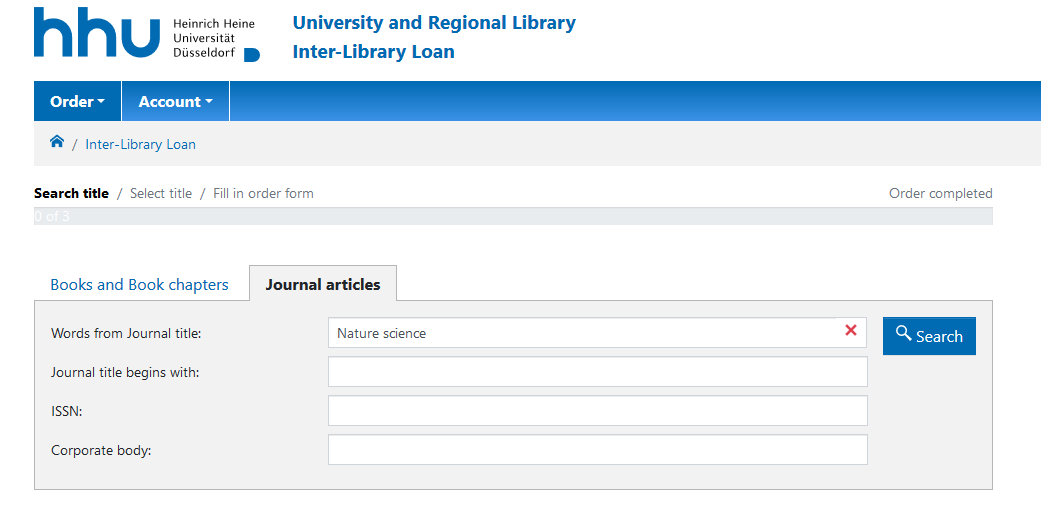 Log in to the interlibrary loan portal and click on the “Journal Articles” tab. Search for a particular journal article, then select the journal you need and click on “To ILL order form”. Now enter the article details, set the desired delivery conditions and click on “Order now”. You’ll find an overview of your active orders including your order history at the top (“Account” tab).